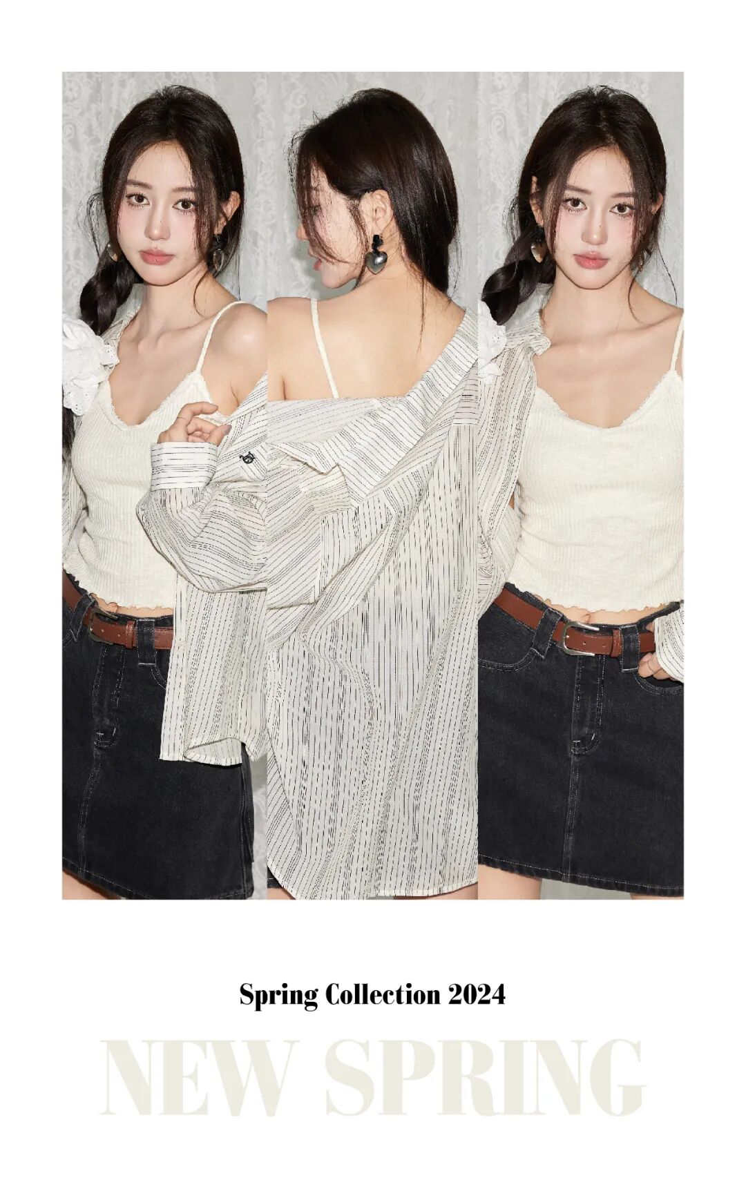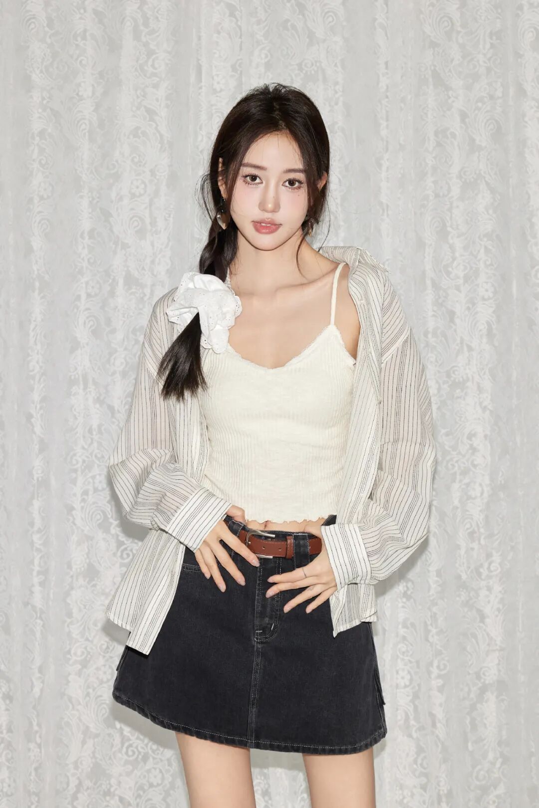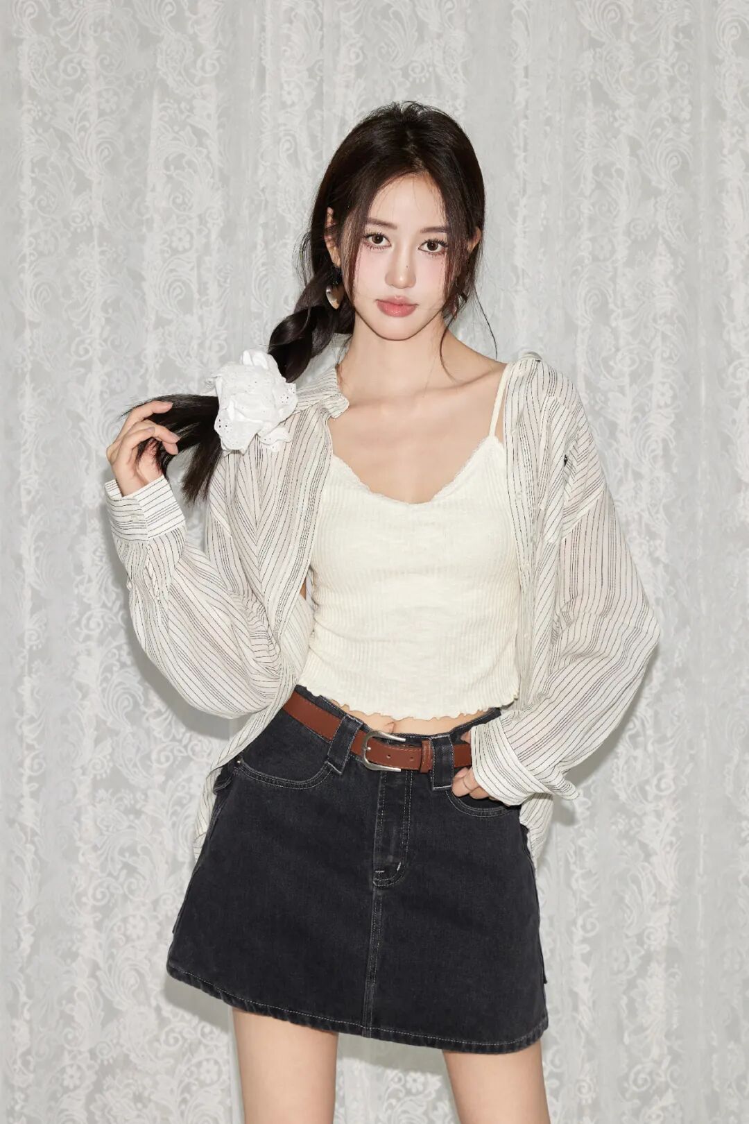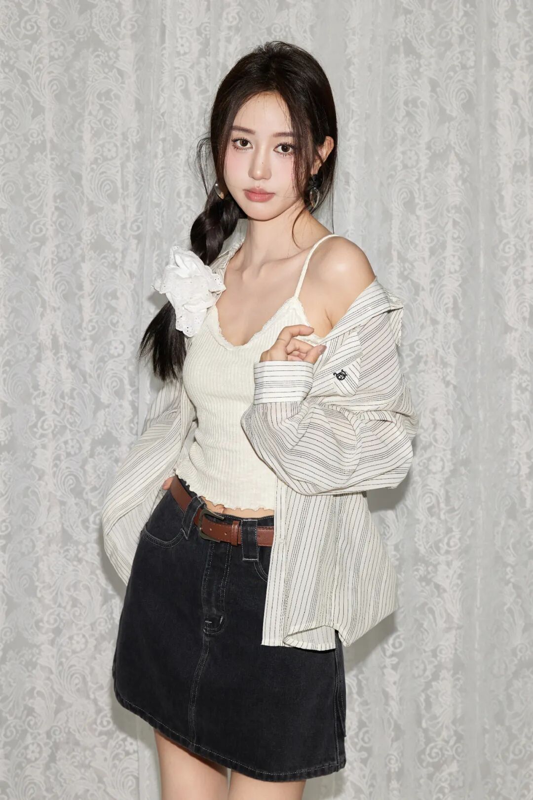 条纹衬衫搭配水洗牛仔短裙