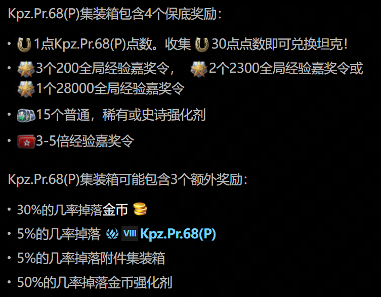 4月5日至4月19日期间,游戏内商店会持续上架可能掉落 VIII级Kpz.Pr.68(P) 的集装箱。