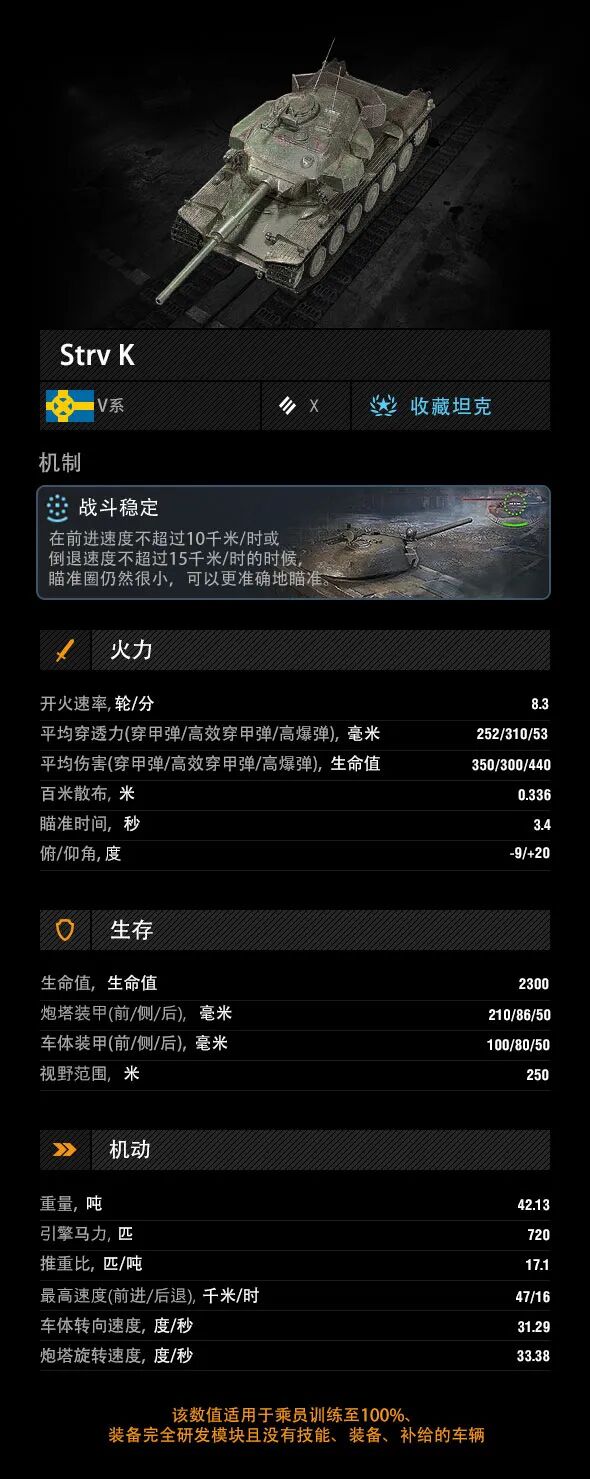 Ⅹ级 Strv K 是一位全能选手。喜欢激烈且带有侵略性的游戏风格吗?那么您一定会喜欢它射速快且穿透力强的主炮!更喜欢相对谨慎的策略?那就根据地形将车体的脆弱部分保护好,并利用主炮9度俯角的特性向敌人发起进攻。当然你也可以选择利用其出色的机动性,在每次射击后迅速撤退到掩体后面,让敌人没有反击的机会。