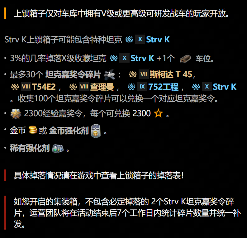 4月8日至4月22日期间,进行对局后您将有机会获得内含 X级Strv K 的上锁箱子!