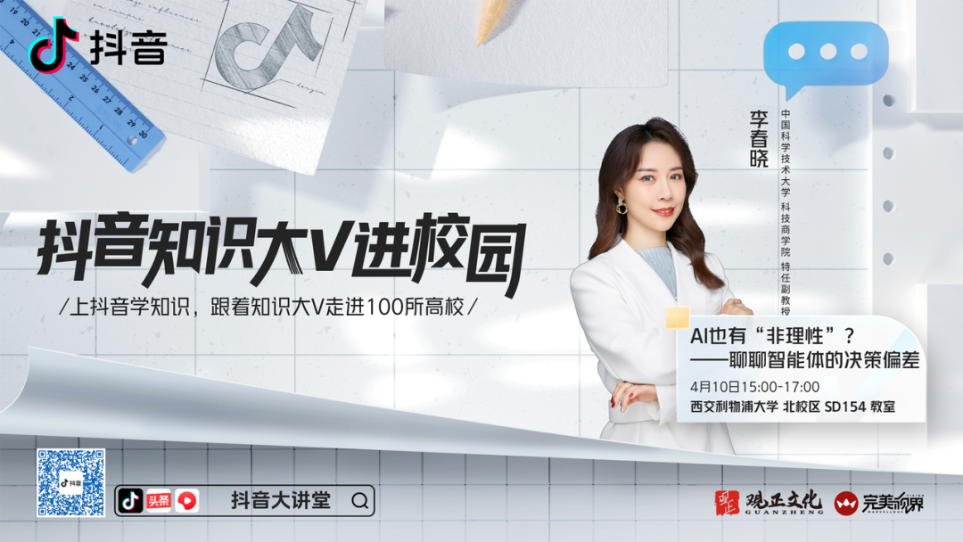 直播简介:人工智能如何进行决策?AI会不会“犯错”?4月10日,中国科学技术大学科技商学院特聘副教授李春晓博士做客【抖音大讲堂】直播间,从行为主义的视角出发,解析AI如何“感知”与“行动”,揭示智能体在决策过程中的心理机制,为大家带来一场关于人工智能决策的精彩分享。