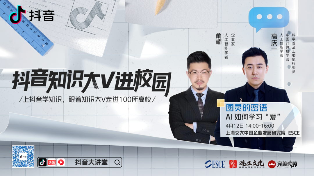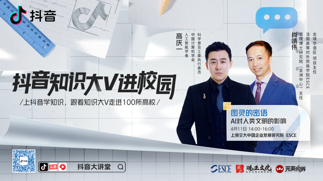 直播简介:在科技日新月异的时代,人工智能的发展已经渗透到我们生活的方方面面,它不仅改变了我们的工作方式和生活方式,更在深刻影响着人类文明的进程。4月11日,人工智能学者高庆一老师与管理博士研究院(亚洲中心)主任肖靖伟博士来到【抖音大讲堂】直播间,探讨AI对人类文明的深远影响。