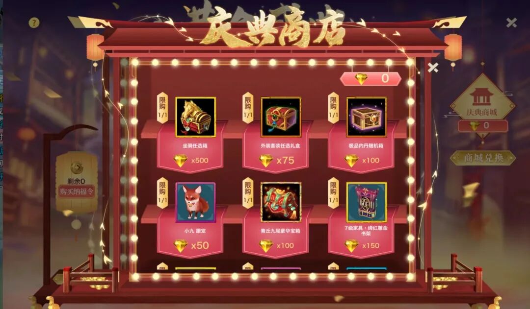金钻可在庆典商店兑换【坐骑任选箱】、【外装套装任选礼盒】、【跟宠·船长】等心仪道具奖励!