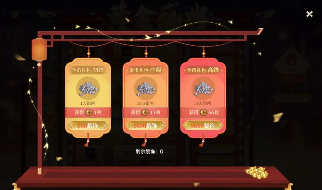 少侠在该活动中消耗黎饰可任意购买三个档位礼包获得不同数量的【金币】,消耗金币即可进行黄金盛典抽奖!