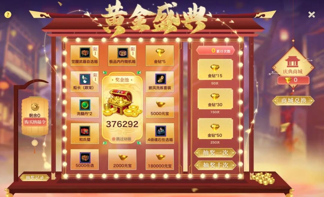 当抽奖次数达到50/150/250次时,少侠还可以获得大量金钻奖励,可用来兑换丰厚奖励!