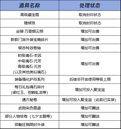 轻装上阵,迎接新版本!以上冗余道具处理将在「梦回忘忧」资料片全服上线后生效,少侠们可以关注一下!