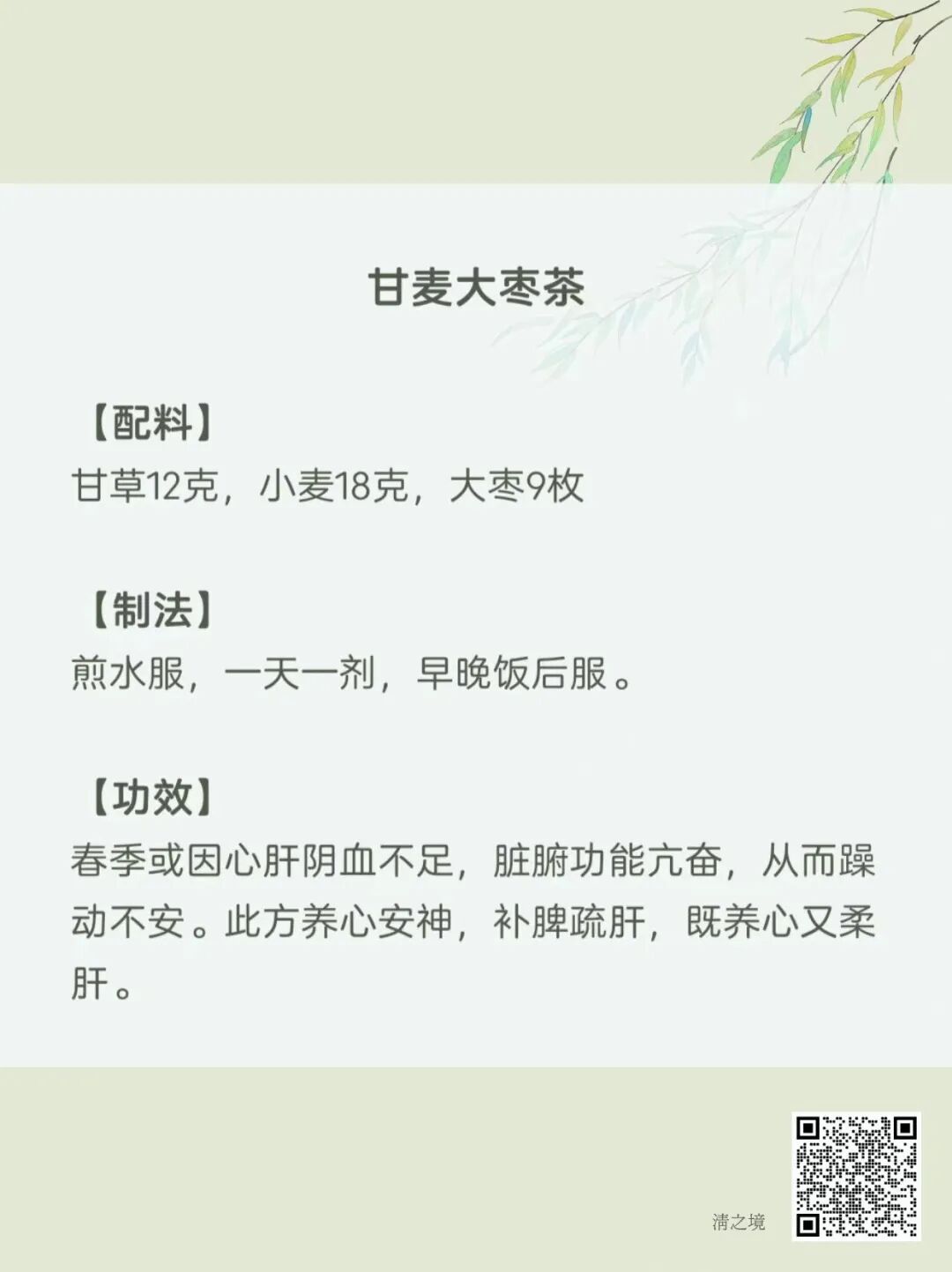 这是一个养心的方子,补脾和中兼能养肝。以浮小麦、大枣、炙甘草为配伍,具有养心安神、柔肝缓急的功效,让我们在春天里减少浮躁、心态更平和。