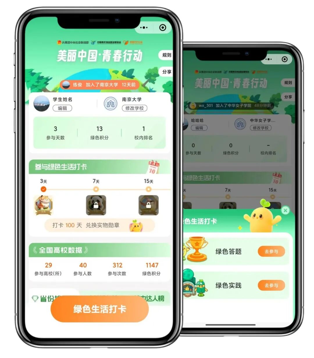 激励2:活动期间,高校绿色积分达万分的Top100高校,将获得千元绿色实践活动包,并将获得下阶段“绿行家”生态文明实践项目优先申报名额。