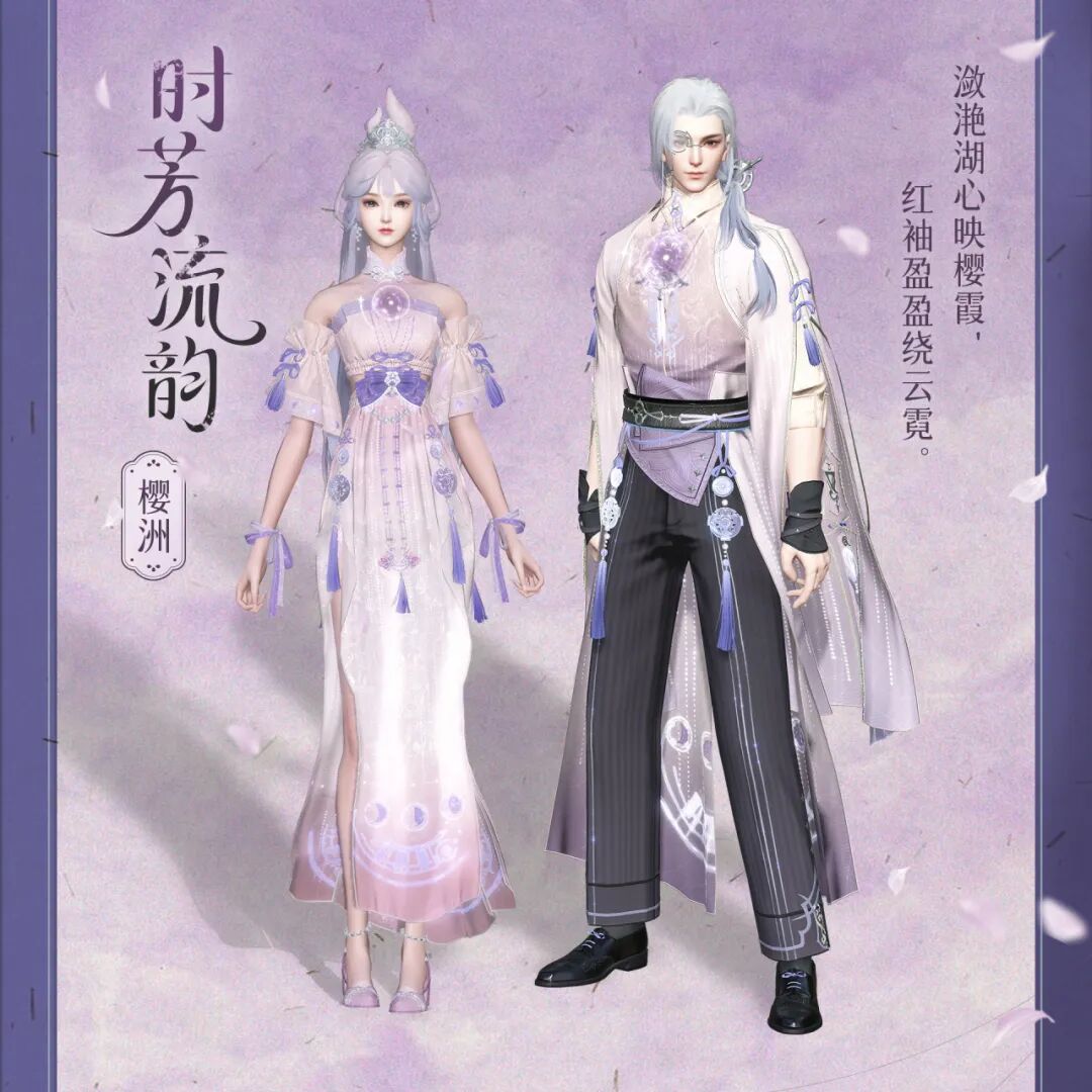 潋滟湖心映樱霞,红袖盈盈绕云霓。轻裙巧绣的【时芳流韵·樱洲】像樱花一般明媚,精细的刺绣搭配上腰间的吊坠,细节满满,粉紫色的配色温柔而不失灵动。