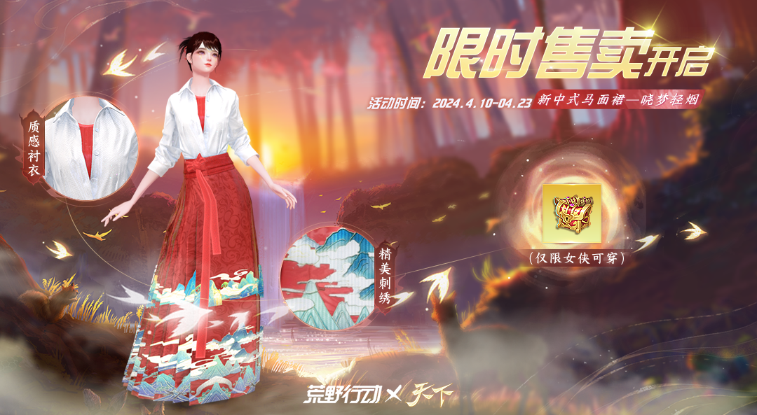 来天下穿新中式马面裙!天下×荒野行动联动时装——晓梦轻烟限时特惠,仅售60元宝,仅限女侠可穿哦~