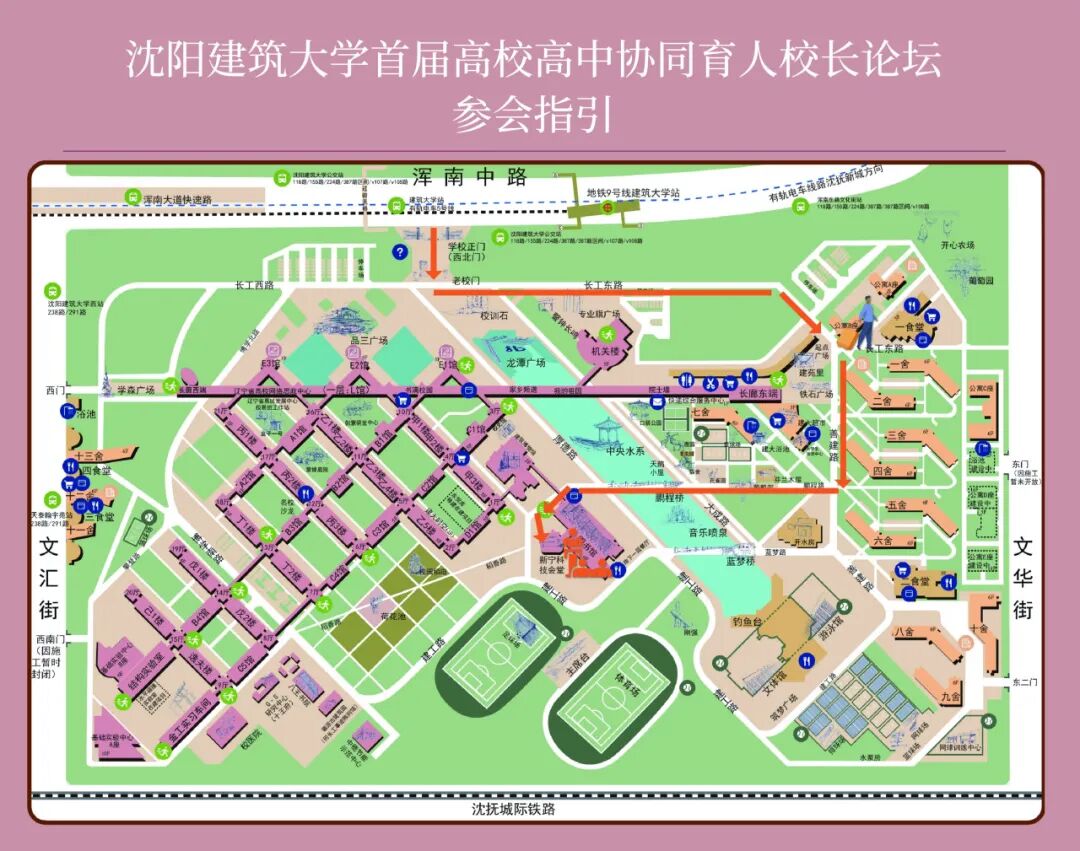 由学校北门入校,沿红色路线可到达报到地点高层宾馆A座一楼。论坛地点在红色路线终点新宁科学会堂。(会务志愿者现场指引,路线详见参会指引图)