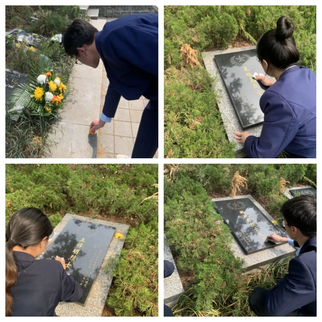 宣誓结束,同学们向烈士敬献鲜花,来到烈士墓碑前,仔细擦拭烈士墓碑并认真清理陵园垃圾。