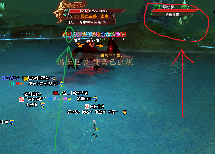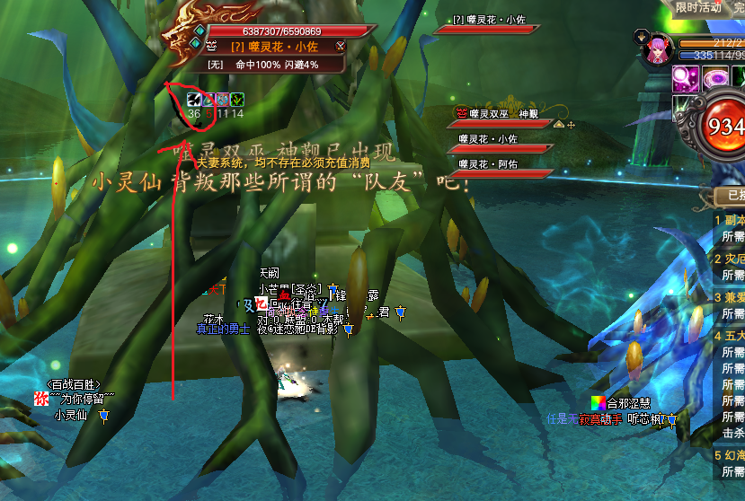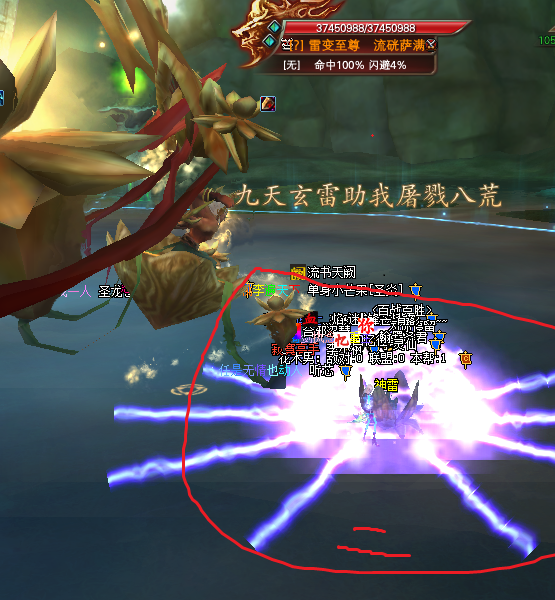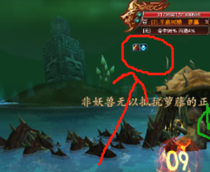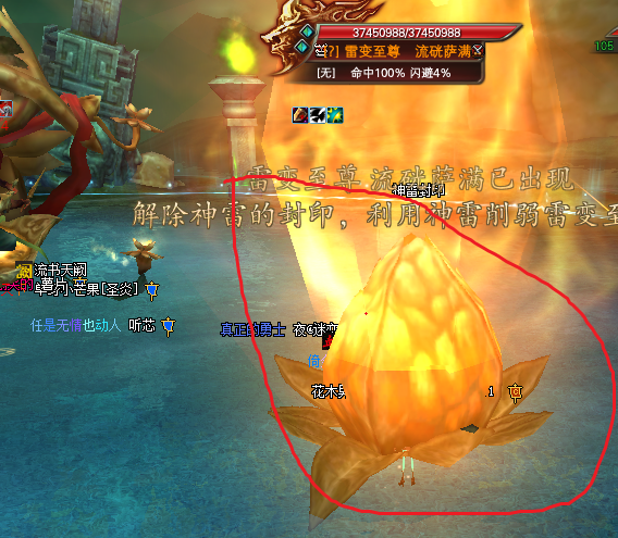 需要第一时间去挖花(花跟怪同时出现,身上满元的伙伴挖),如我图一红圈标示,挖完后,花就变成雷电阵(九天玄雷),如图二红圈所示,把怪马上拉到雷电阵里,雷电阵可以把怪身上的双免状态去掉,这样才能打怪。
