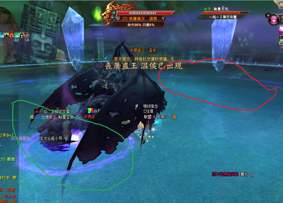 注意事项,BB出来后,谁第一个打它,它就给第一仇恨释放一个小紫色圈,如图片我绿色标记所示。紫圈持续高伤害,需要跑出来,接下来3秒后BB为中心,脚下再出一个紫色圈,并会360°向周围扩散,同时拉所有玩家到它脚下,一般人就跑出圈到外围,但不能跑出我图片红色标记圈着的石柱大框架,否则秒全队玩家。