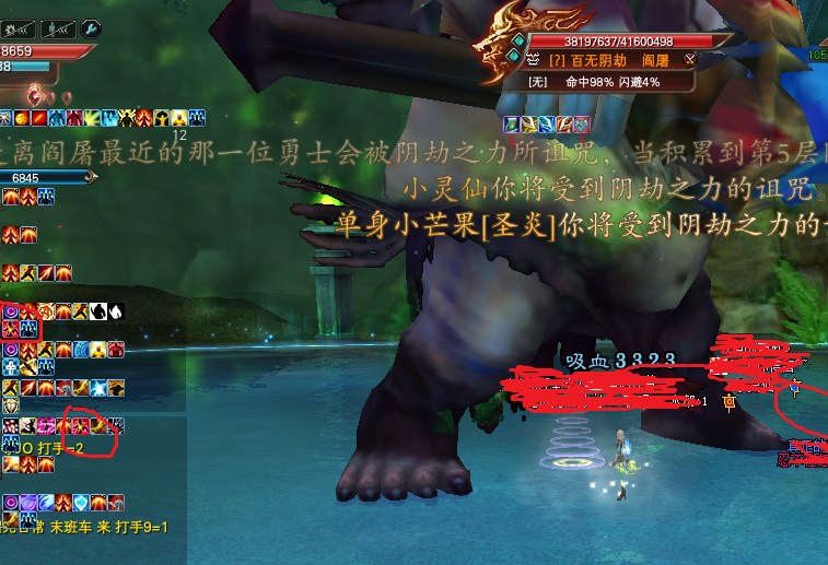 13关不难打,没太多机制。怪会每隔15秒左右瘫痪一次人,从出现开始,就不停的给最靠近它那个人上诅咒状态,如图中左边小红圈标示状态,屏幕也会出现字体提示,当达到5重就秒人。1-4重也会持续掉血,重数越多掉得越快。