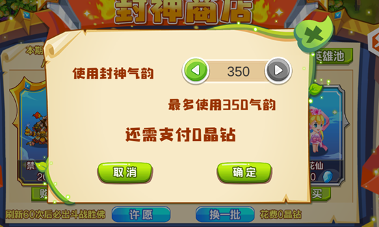 A2:进入魔法池点击上方【封神商店】即可看到【许愿】按钮,点击【许愿】可选择任一喜欢的守卫,选择后点击确定,即可在60次【换一批】内,看到对应守卫,此时可以花费晶钻和封神气韵进行购买。