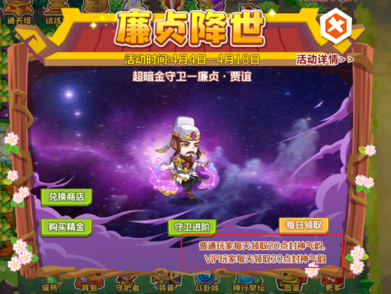 封神气韵可通过魔法池【每日任务】每天获取50气韵,或通过4.4-4.18限时守卫活动【廉贞降世】每天领取。