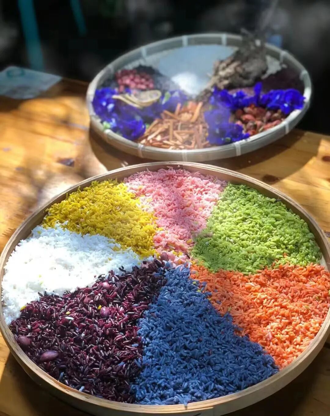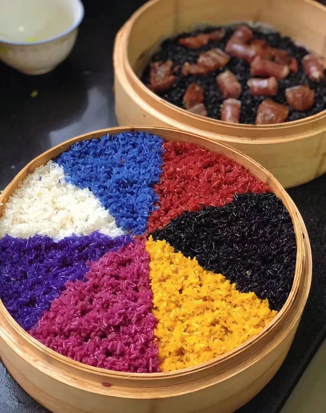 兔耳弯弯:“广西的清明节最少不了的就是五色糯米饭了!纯植物侵泡过的糯米各有清香,别有风味,搭配腊肉、腊肠味道更是不可言喻,是绝对的纯天然美食!糯米蒸煮后色彩更有光泽,五彩斑斓的,口感是软软糯糯的,我最喜欢吃红糯米,它的味道有些甘苦,但是让人回味无穷,感觉自己一个人可以吃上十斤!”