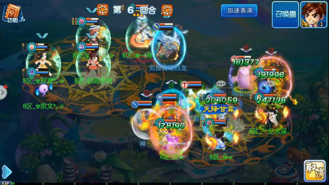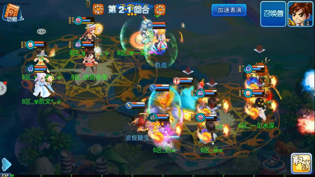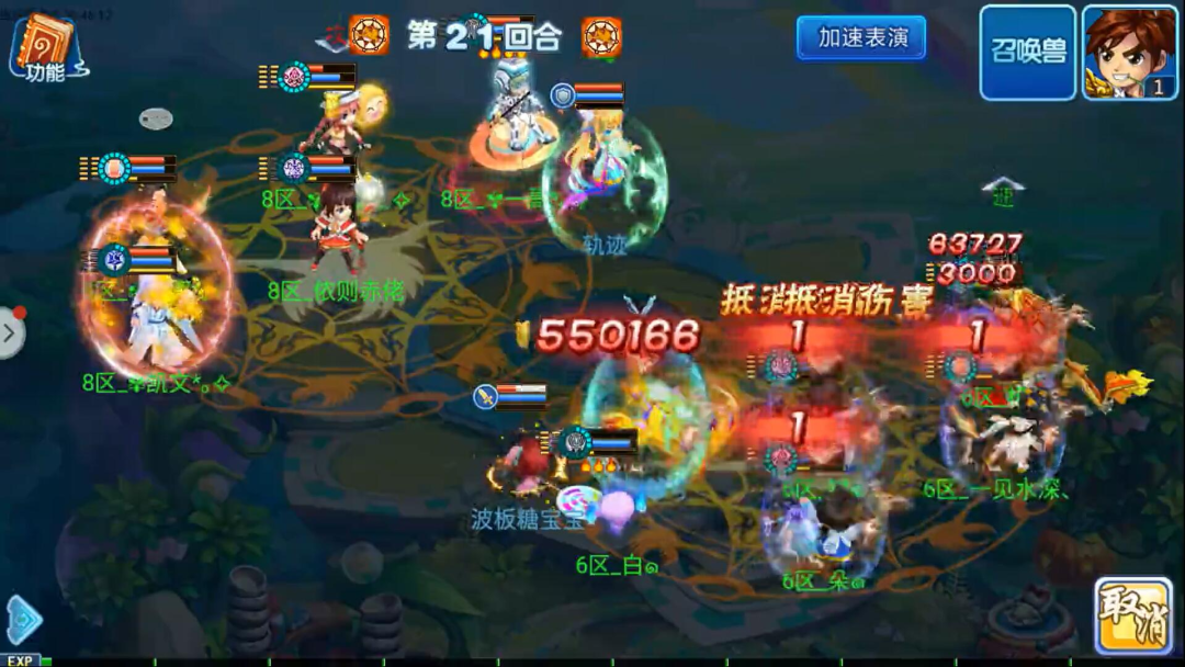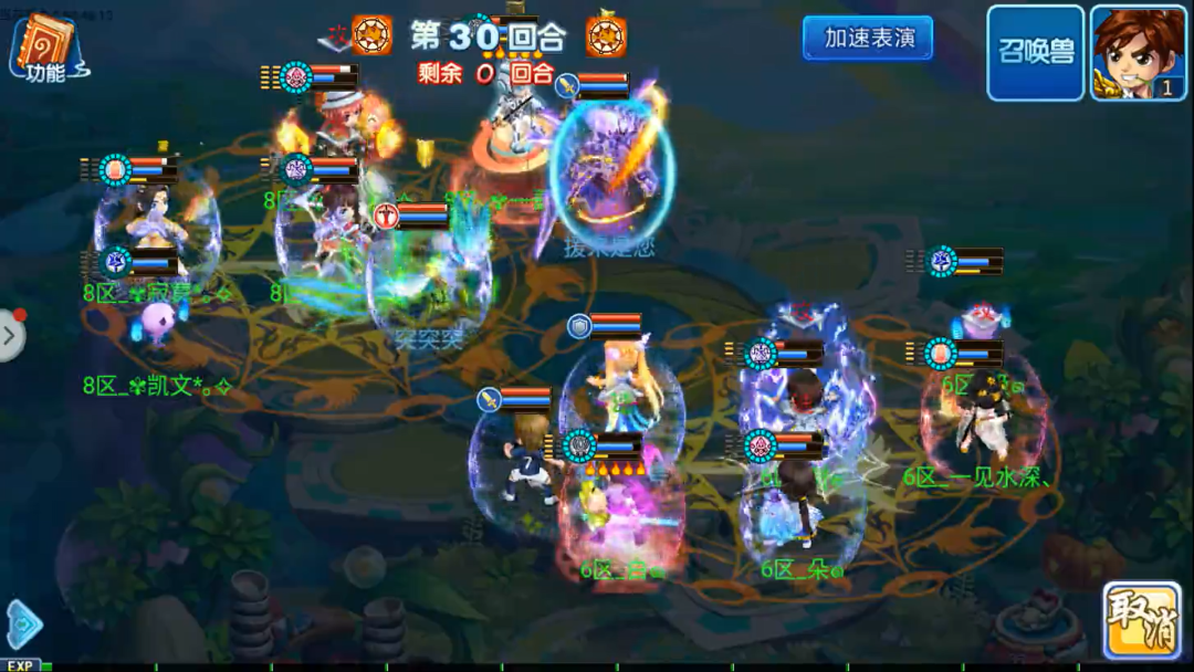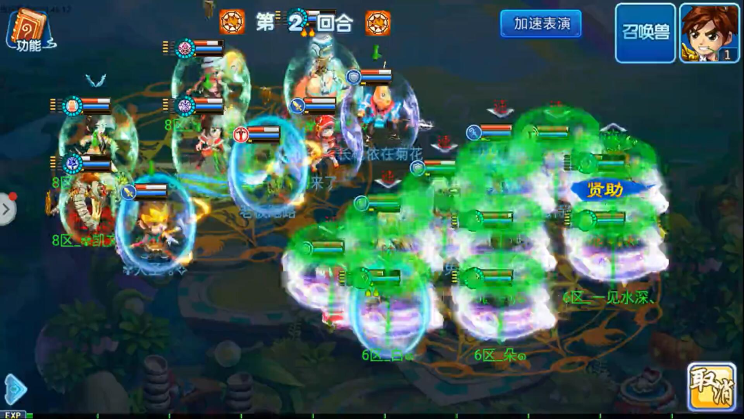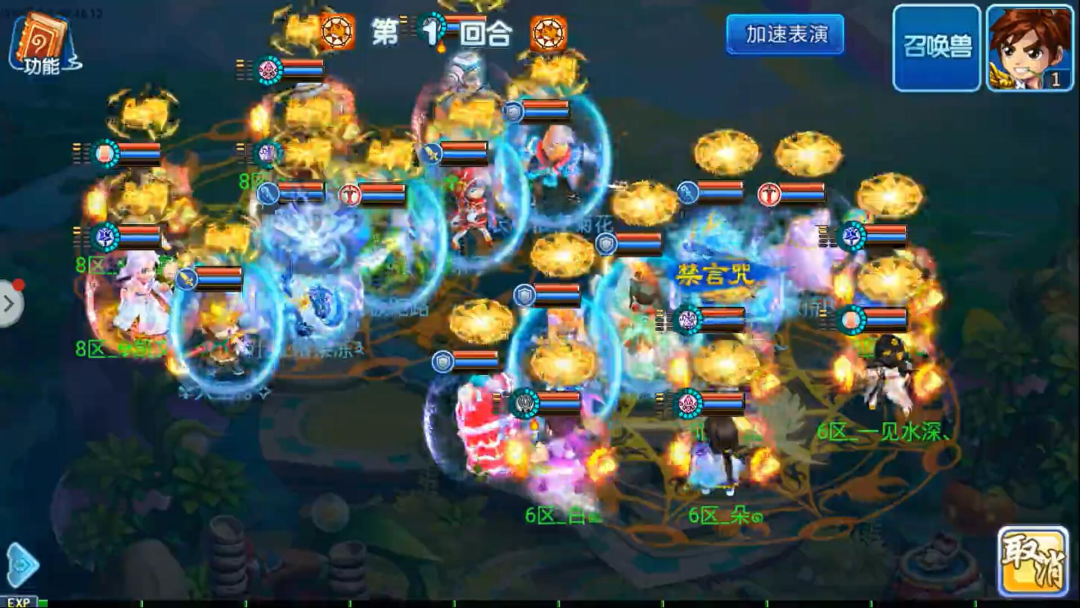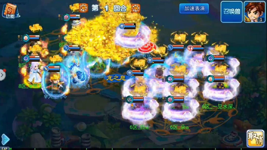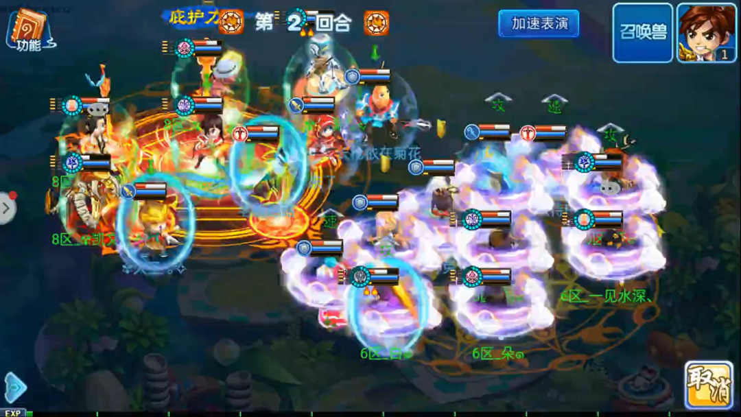 第二回合开始,两队的飨灵都开启了注灵技能“贤助”,来为己方的成员增加护盾来抵挡伤害和免疫负面状态。随后【朵的战队】的召唤兽再次使用出“祁天”来为己方成员增加灵巧度,紧接着道士再次使用“禁言术”,而这次被控制的是【梦之队】的刀客。同时【梦之队】的道士也出手将【朵的战队】的飨灵“禁言”。之后【梦之队】的医生使用技能“庇护立场”以保护己方的防御能力,同时召唤兽皮皮虾和孙小萌也分别使用了“大还丹”和“龙珠领域”,成功将命悬一线的时客和刀客的血量恢复到了满血。![]()