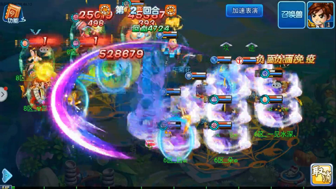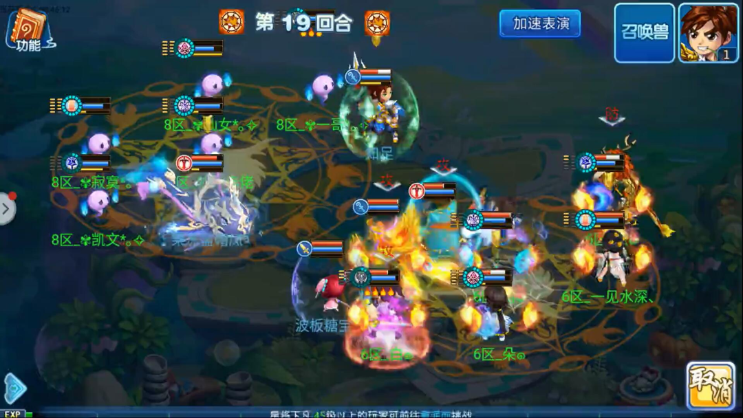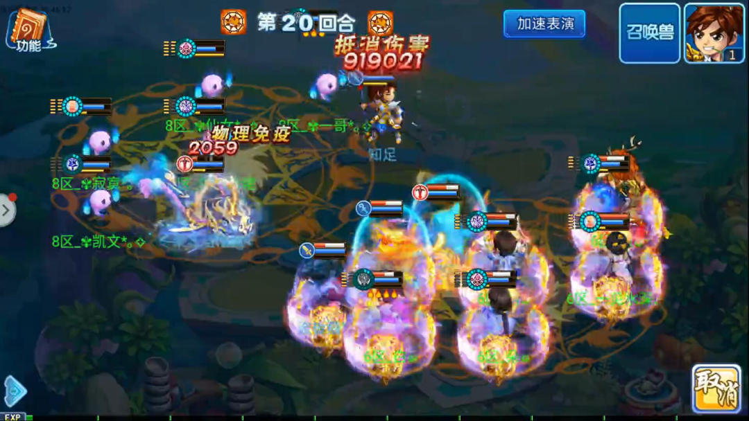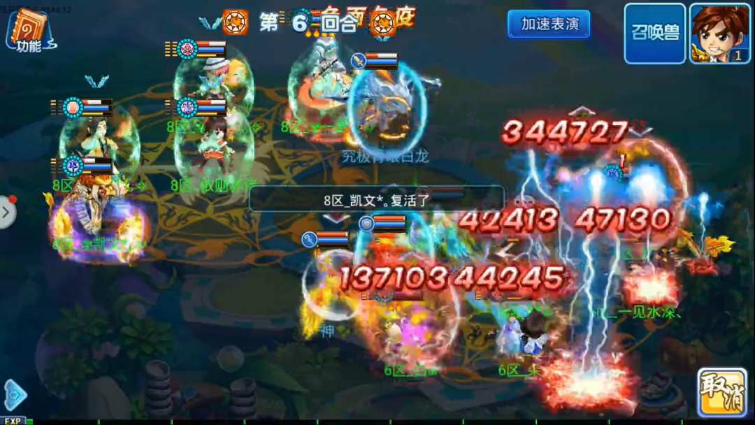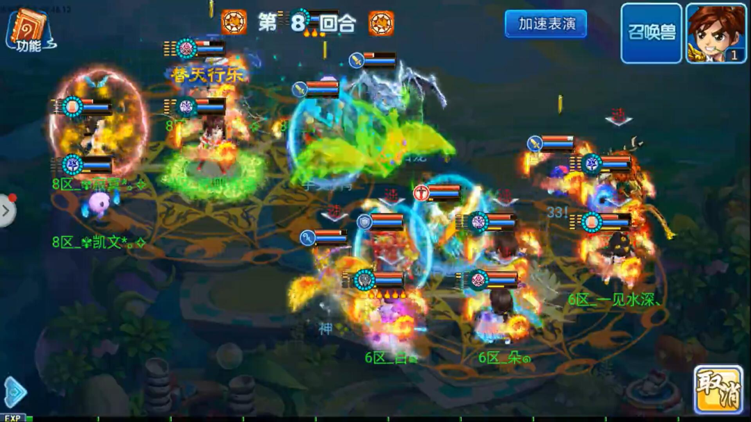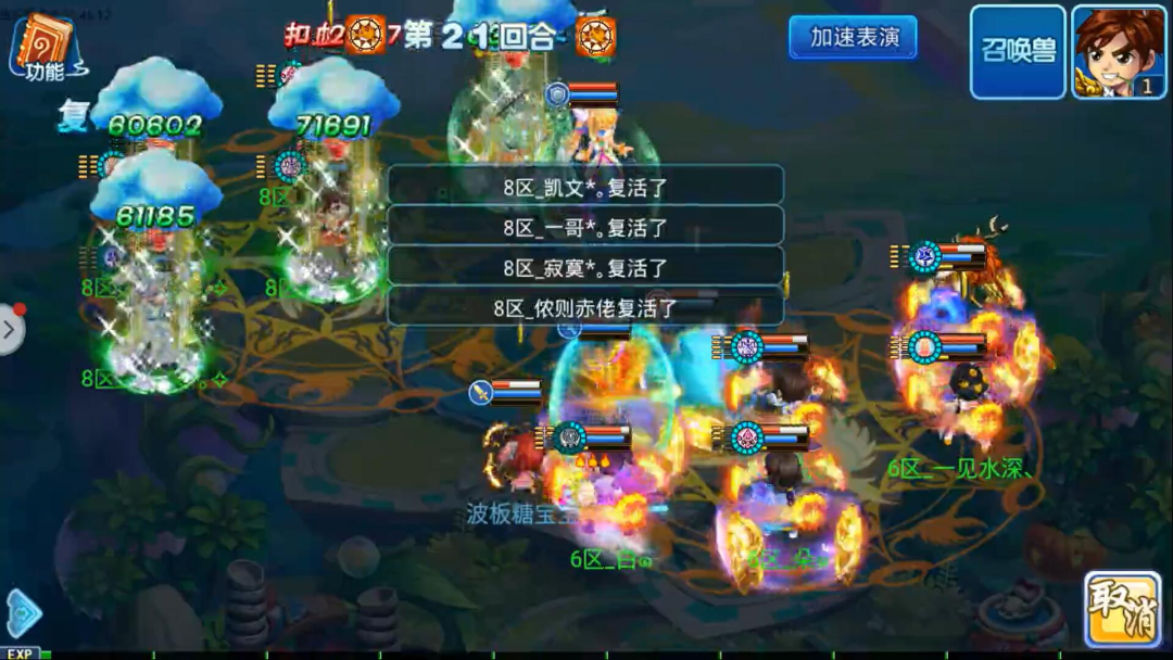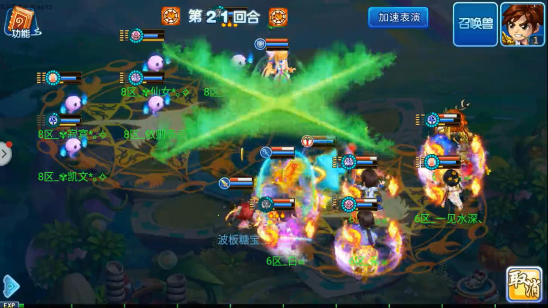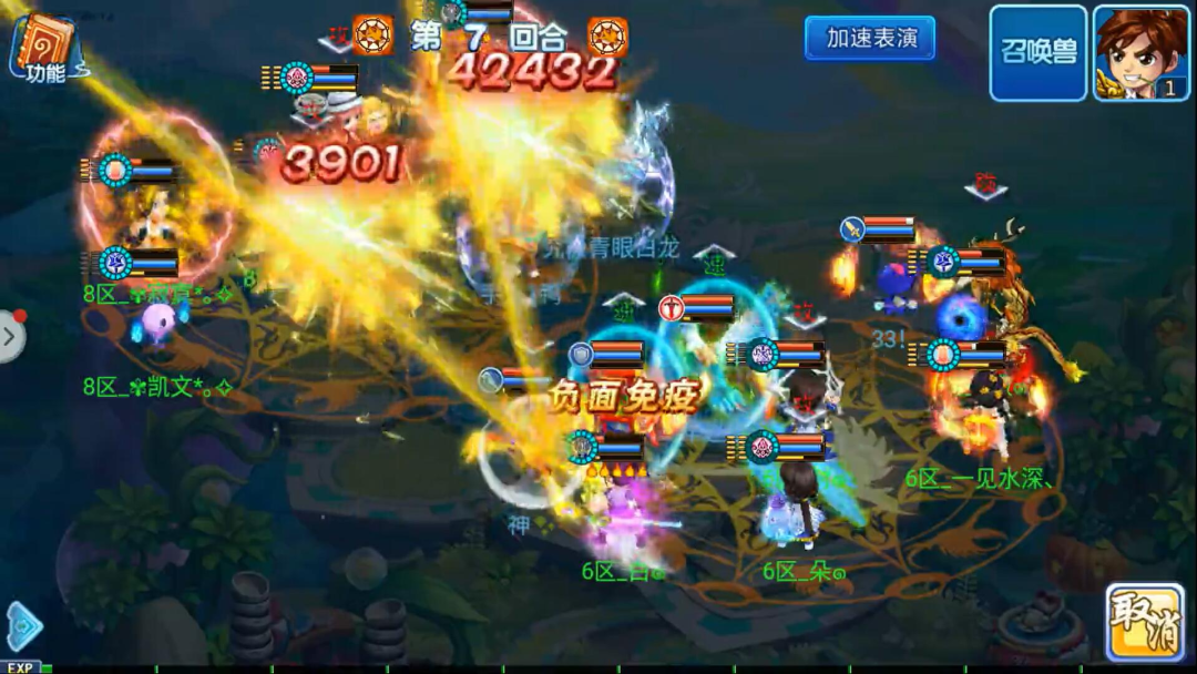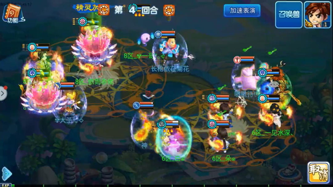 第二回合开始,两队的飨灵都开启了注灵技能“贤助”,来为己方的成员增加护盾来抵挡伤害和免疫负面状态。随后【朵的战队】的召唤兽再次使用出“祁天”来为己方成员增加灵巧度,紧接着道士再次使用“禁言术”,而这次被控制的是【梦之队】的刀客。同时【梦之队】的道士也出手将【朵的战队】的飨灵“禁言”。之后【梦之队】的医生使用技能“庇护立场”以保护己方的防御能力,同时召唤兽皮皮虾和孙小萌也分别使用了“大还丹”和“龙珠领域”,成功将命悬一线的时客和刀客的血量恢复到了满血。![]()