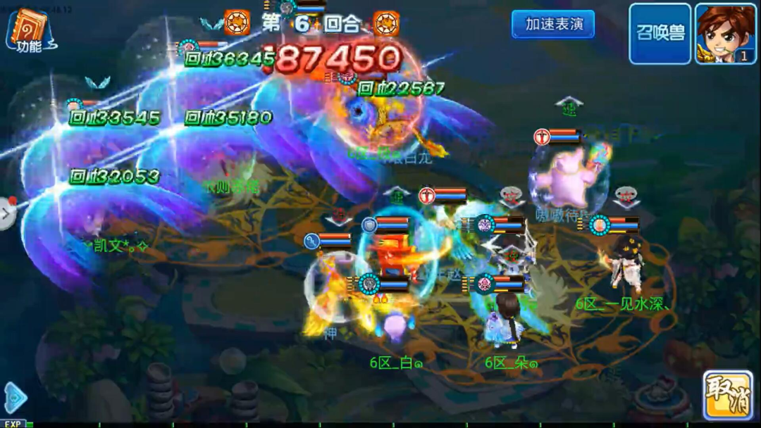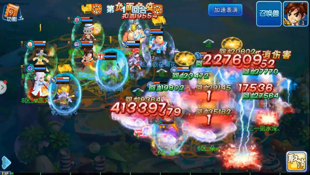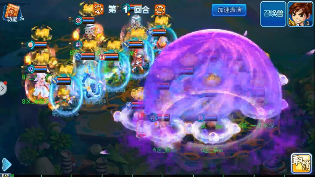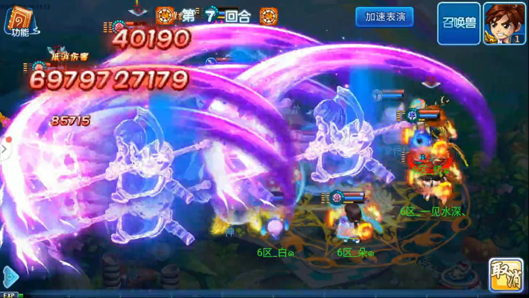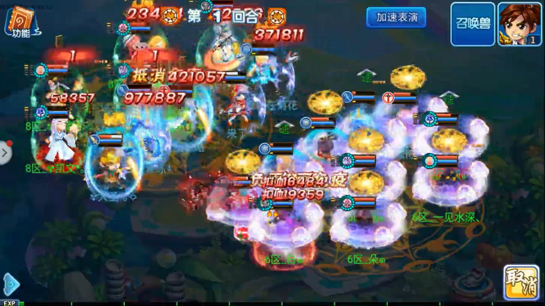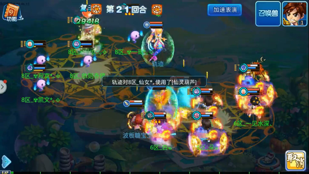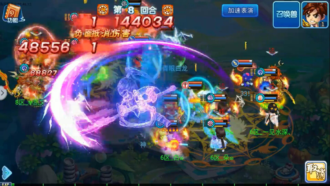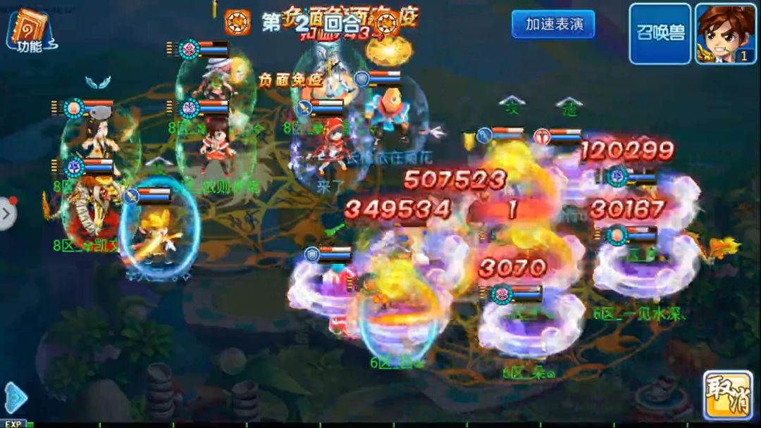第二回合开始,两队的飨灵都开启了注灵技能“贤助”,来为己方的成员增加护盾来抵挡伤害和免疫负面状态。随后【朵的战队】的召唤兽再次使用出“祁天”来为己方成员增加灵巧度,紧接着道士再次使用“禁言术”,而这次被控制的是【梦之队】的刀客。同时【梦之队】的道士也出手将【朵的战队】的飨灵“禁言”。之后【梦之队】的医生使用技能“庇护立场”以保护己方的防御能力,同时召唤兽皮皮虾和孙小萌也分别使用了“大还丹”和“龙珠领域”,成功将命悬一线的时客和刀客的血量恢复到了满血。![]()