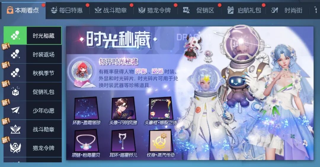 3月14日时光秘藏更新,打开时光秘藏必定获得时光碎片*1且有几率获得环影及返场外显,包括环影·盈霜落琼、时装·合黛涟漪、发型·合黛涟漪、时装·天际漫游、发型·天际漫游、头像·丹明风雅、头像框·爆裂之诗、项链·粉海星贝、耳环·喵星铃儿、纹身·蒸汽传动、聊天气泡·芝心冻冻;还有12级元素圣核、金色继承者技能、金色共鸣晶片、时光碎片*99等超值奖励。