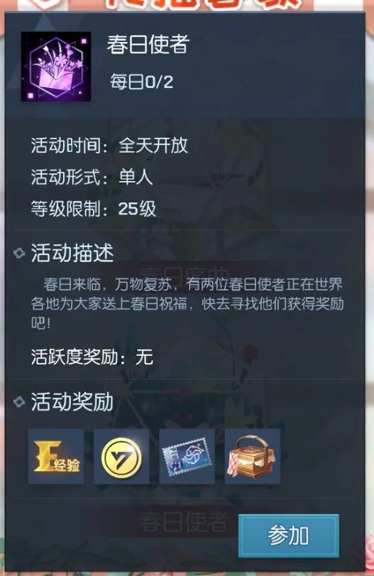 3月14日6:00-3月27日24:00期间,找到世界各地的春日使者们,即可获得经验、金币、秀野踏青礼盒、星海鱼影礼券等好礼哦~