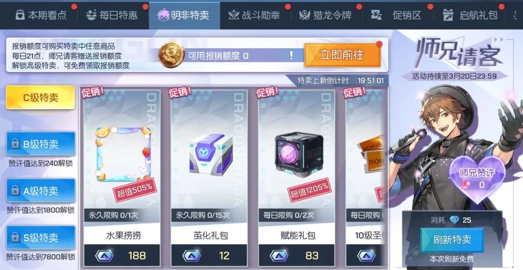 购买特卖中的商品可以获得路明非师兄的赞许,逐渐开放高等级特卖,每次解锁新特卖时,可在师兄请客界面领取奖励!购买货架商品可逐渐解锁包括头像框·荣仪进行曲、纹身·黯光之心、头像·鼓乐擎旗、头饰·怪兽泡泡和限时返场的头饰、头像、纹面、龙纹升级材料等超值商品!