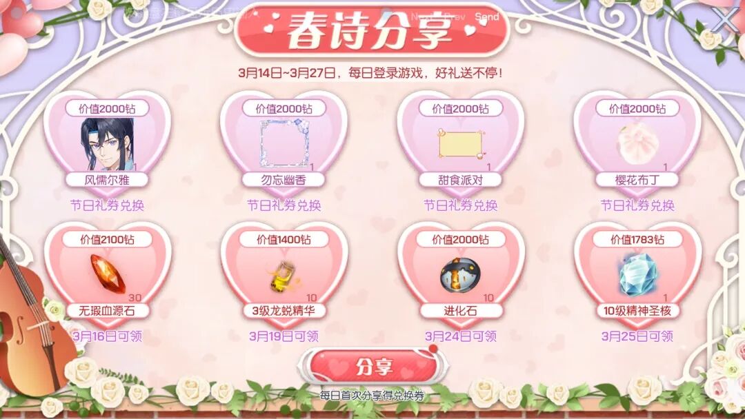3月14日更新后至3月20日24点,赠送礼物限时8.8折哦!快对心爱的TA大声说出你的心意吧!