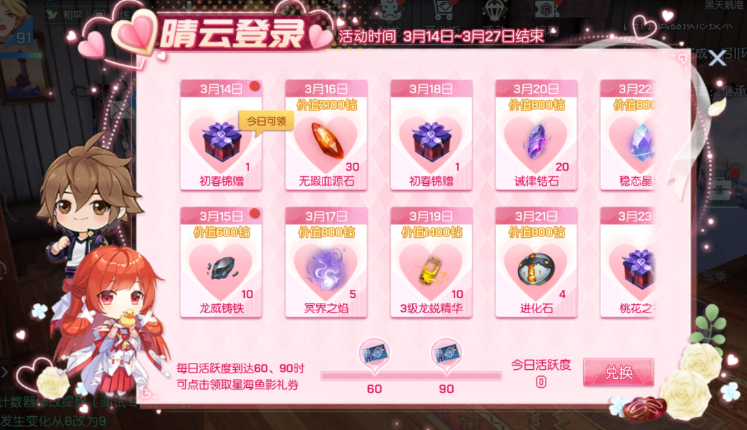 3月14日6:00-3月27日24:00活动期间,每日登录及达到指定活跃度,即可领取无瑕血源石、3级龙蜕精华、进化石、10级精神圣核、星海鱼影礼券等好礼~