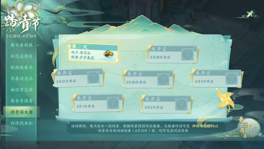 3月28日至4月3日活动期间,各位少侠每天可以收到一段神秘线索,只有根据线索找到对应地图,与指定NPC进行交互,才可获取神秘信封奖励。NPC将随着线索随机出现且位置也会发生变化。各位少侠一定擦亮双眼,找到线索后的神秘人物领取奖励吧!