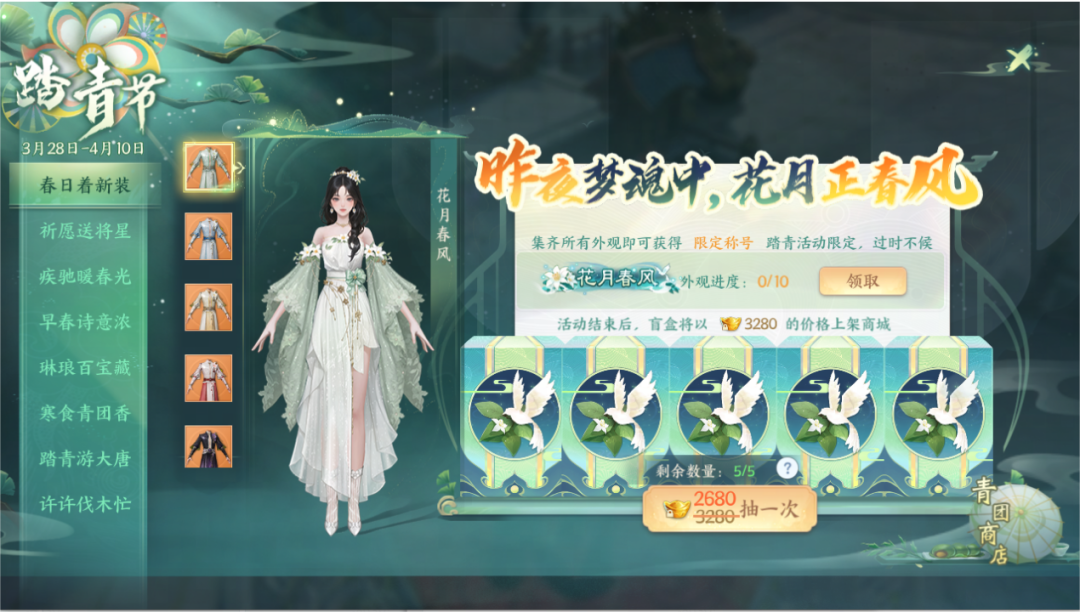 每位少侠可以购买盲盒套装最多5次,5次后将获得全部时装和挂件!集齐5个套装后,将拥有特殊天下公告,与天下侠士们一起分享帅气英姿!本次踏青节活动期间收集齐盲盒的玩家可以获得特殊限定称号“花月春风”,过时不候哦!
