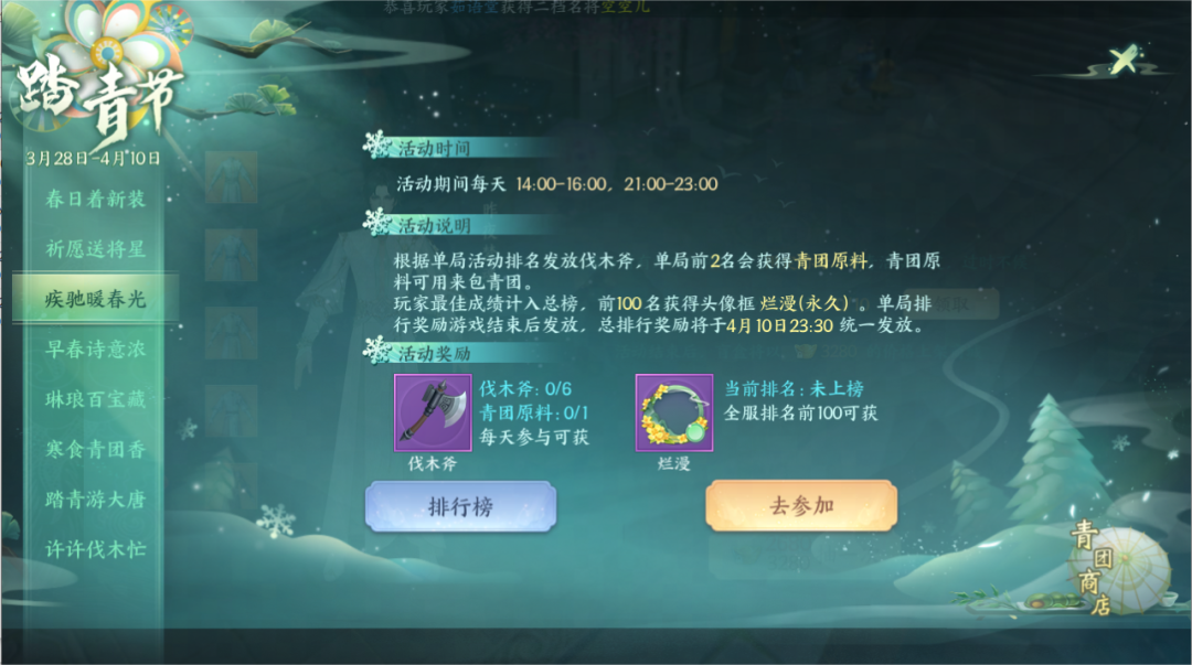 既然是比赛那奖励当然少不了,双儿给大家准备了富有春天气息的特别奖励——青团原料!全服排名前100的玩家还将获赠清明主题头像框“烂漫”!少侠们还在犹豫什么,现在就畅意奔跑,尽享春日风光吧!