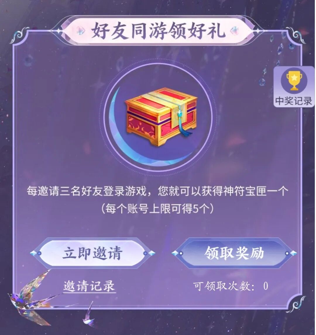 好友同游领好礼!活动期间,少侠们邀请三名好友登录游戏,即可领取神符宝匣一个,每个玩家最多可领取五个!另外回归玩家及新玩家还可一键领取专属礼包!双儿悄悄爆料,礼包内含有常驻星券哦,赶紧上线和小伙伴们一起享受丰富华丽的白色情人节活动吧~