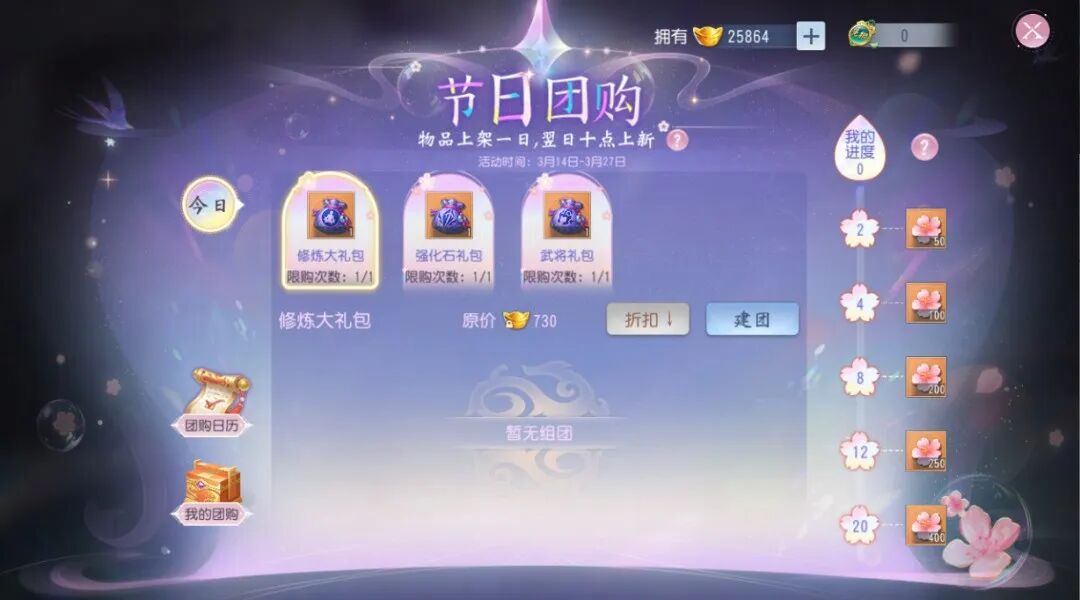 团购活动折上折,优惠好价享不停。3月14日至3月27日期间,节日团购将再次上线~少侠们可以自由发起团购了!只要成功完成团购,即可获得珍贵的免拼卡,立即享受折扣优惠!更令人兴奋的是,使用免拼卡参与团购后,还有机会获得新的免拼卡,多拼多得,优惠连连!