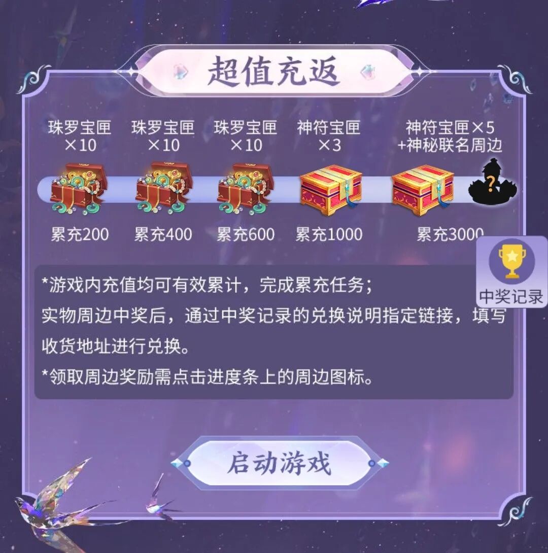 累充大回馈,超值礼包领到手软!活动期间累充每达到一定额度,不仅能享受游戏内的礼金券优惠,还可在活动页面收获对应奖励!累充200、400、600分别可收获10个珠罗宝匣;累充达1000可领取3个神符宝匣,达3000元时,不仅可以获得5个神符宝匣,还可以领取神秘联名周边!