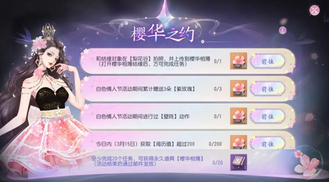 在这次的白色情人节活动中,樱华之约也浪漫开启啦~互生情愫的少侠可以相约梨花谷、白屏寨、论剑山庄等风景胜地,携手共同完成各种任务,赠花、牵手、依偎、壁咚……有情人在亲昵相伴时感受迅速升温的氛围和脸红心跳的瞬间,打造妙趣横生的浪漫回忆,还可以通过这些任务获得海量活动代币,去活动商店兑换珍稀道具~