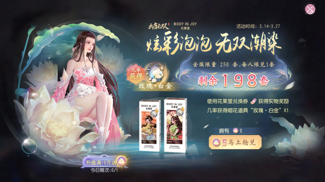 《大唐无双》手游×花果里的联名活动也与本次白色情人节版本一起回归啦!活动期间,少侠可使用花果里通宝兑换“国潮泡泡染”联名炫色限定礼盒!在获得联名礼盒的同时,还有概率获得烟花道具“玫瑰·白金”!在这浪漫的情人节时刻,一个烟花就能博得美人展颜一笑,快快行动起来吧!双儿温馨提示,多余的花果里通宝还可以兑换珠罗宝匣,不过务必记得在活动结束前使用哦!