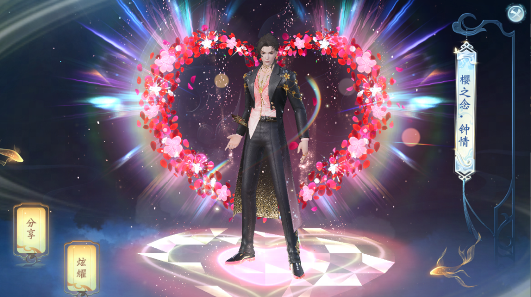 而男款新时装则是与女款相配的、酷炫帅气的西服套装。一身黑色外衣低调沉稳,肩膀处缀着金色的樱花,衣摆藏着点点星辉,樱粉内衬与女款形成呼应。这便是白色情人节限定时装,思心之所恋,念情之所爱。