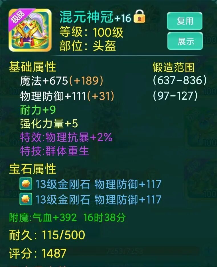 物理抗暴+群体重生,少侠这套装备有3件有群体特技,又有治疗又有太极,而这件群体重生直接拉满,复活队友诶美滋滋!还能抗住物理暴击~