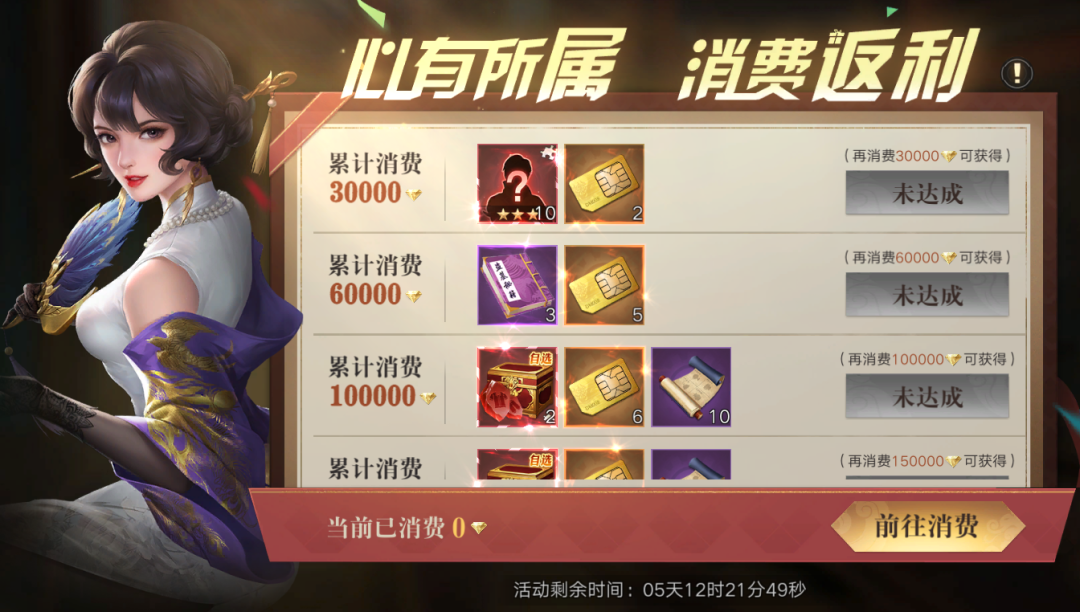 消费达到规定金钻还可以领取流光血玉、九天圣装原石、圣装碎片自选箱、SSR随机伙伴碎片、电话卡等等奖励!消费越多福利越多!