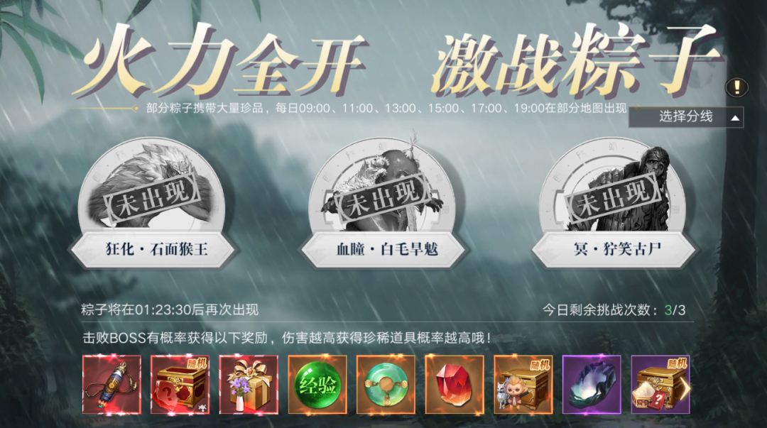 每日09:00、11:00、13:00、15:00、17:00、19:00在部分地图出现,记得准时狩猎粽子哦~