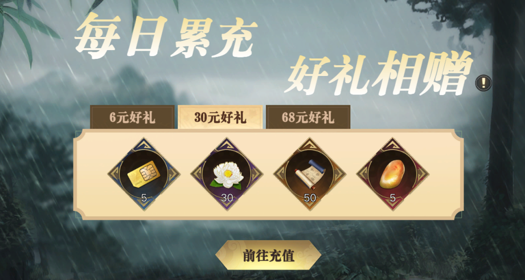 充值满30元,额外获得电话卡*5、泼水纳福兑币*30、九门秘籍*50、昆天脂玉*5