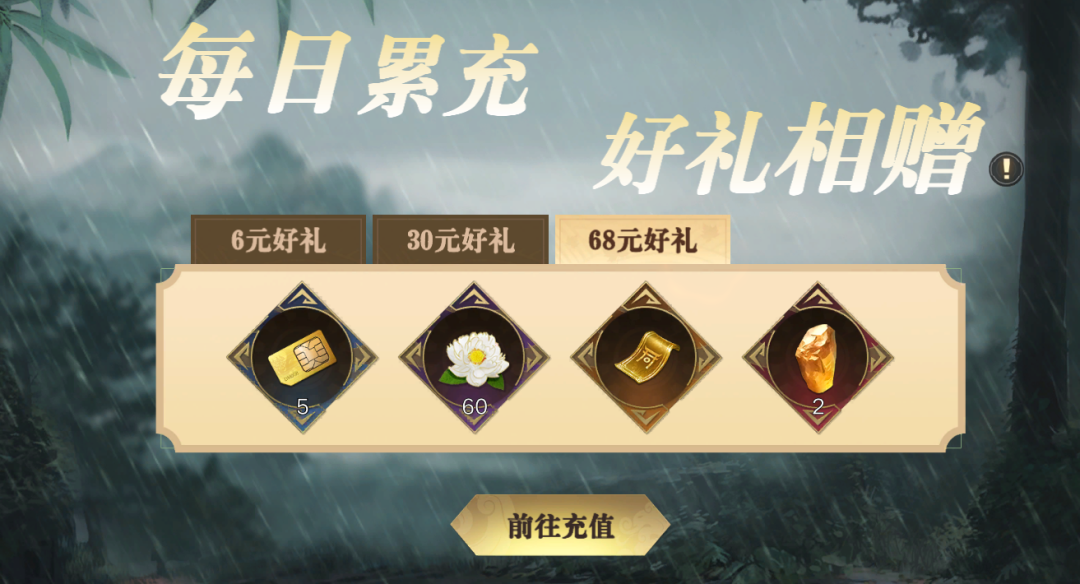 充值满68元,额外获得电话卡*5、泼水纳福兑币*60、阴阳符*1、田黄石*2