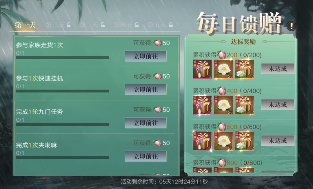 活动期间,每天登录领取奖励,总计泼水纳福兑币*72、电话卡*10、九门秘籍*50、金钻*17328、中级伙伴技能书随机包*1