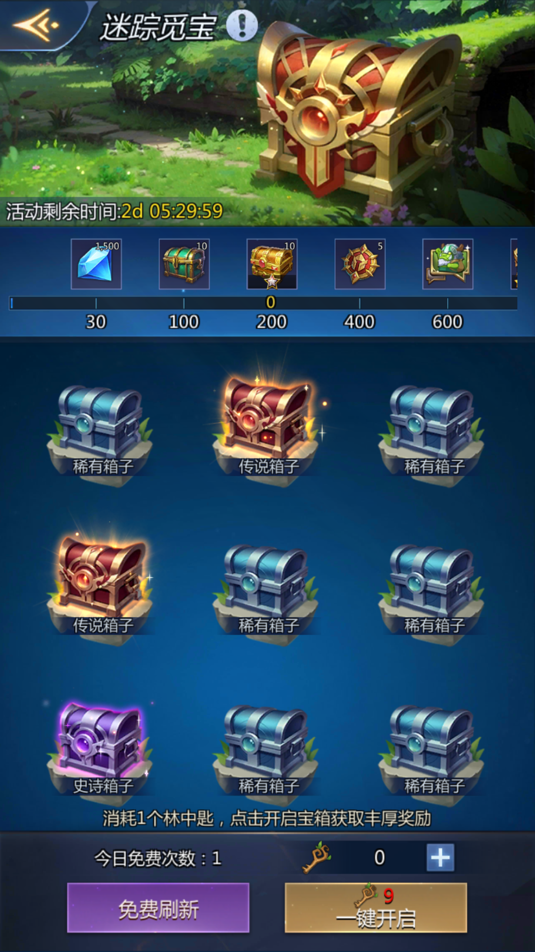 1.领主大人每次将随机找到9个宝箱,分为稀有、史诗、传说三种品质,开启不同品质宝箱消耗的林中匙数量相同,但箱子品质越高,里面的奖励越丰厚。
