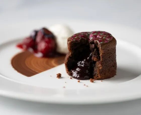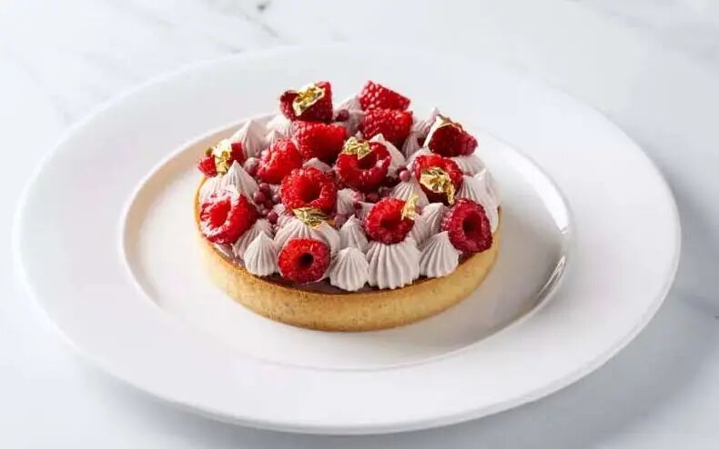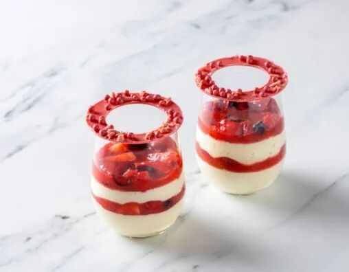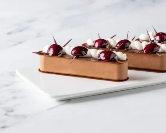 光滑、甜美的白巧克力与色彩浓郁的酸浆果搭配,形成华丽的对比,对食客形成视觉和味觉的双重吸引。
