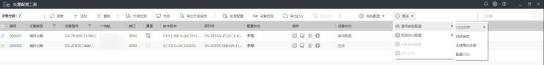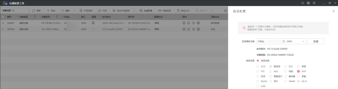 2、一键化配置后,设备会添加到设备列表,可以单台设备作为模版进行其他设备的参数批量下发