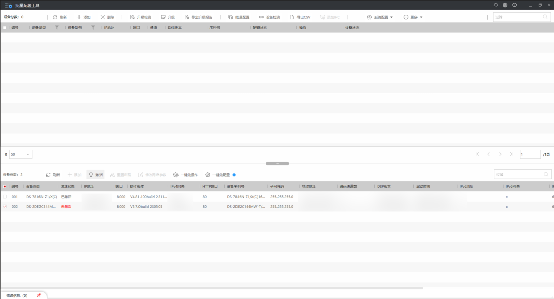 1、打开软件后可看到搜到的设备,可进行一键化配置,批量进行快速激活设备,修改密码、修改网络信息、设备升级等操作