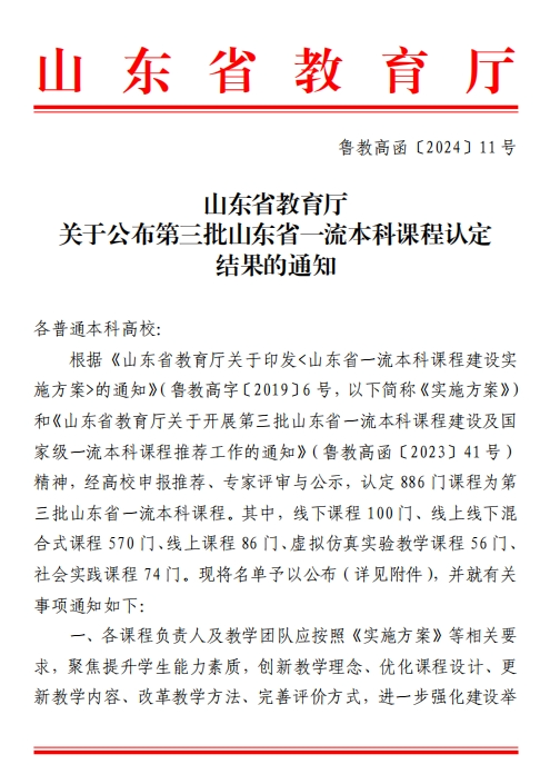 近日,山东省教育厅公布第三批山东省一流本科课程认定结果,我校共有21门课程入选。